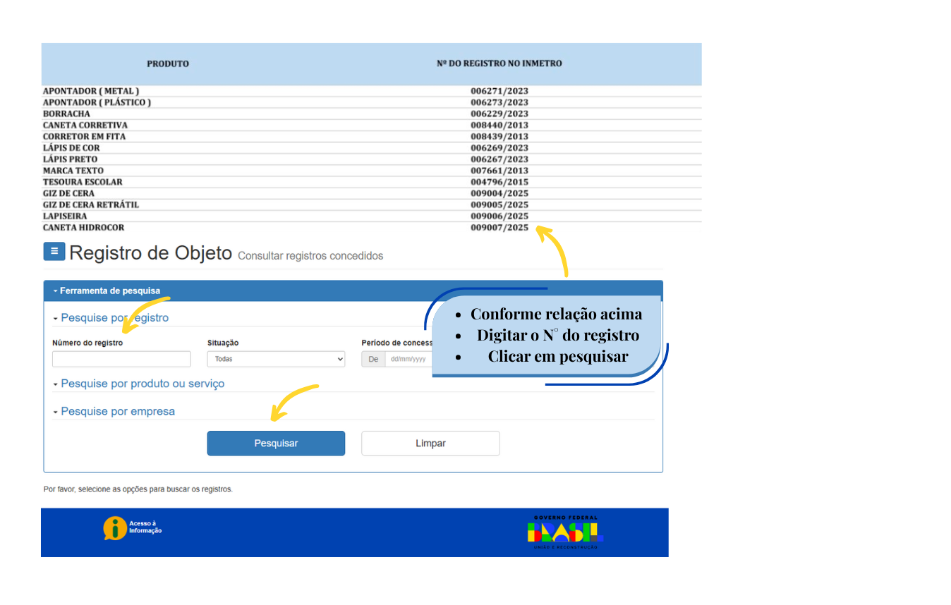 Acessar o site do INMETRO e digitar o número do registro conforme ilustração á seguir:
